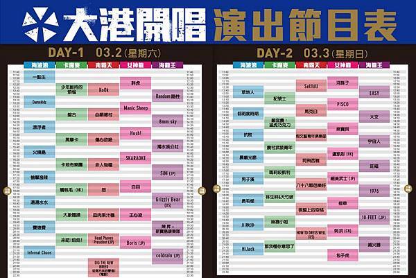 Damnkidz→漂浮者→火燒島→SIM→恕→Grizzly Bear→血肉果汁機→賽德費→來吧!焙焙!→Coldrain